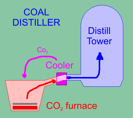 In the picture there is diagram for process, with what you can extract oil from coal without chemical catalysts.When you warm the coal in CO2 furnace, with electric resistors, you can raise the heat as high as you wish.