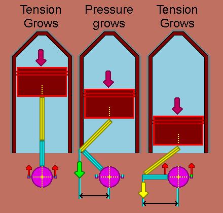 System can be and was sometimes made so, that at least one axle is sucking and converting the straight forwarded power to rotation all the time. When so, one pair of axles must have 90 degree difference in the mounting points. So that they are never in the loose Y - quarters at the same time. The stronger you make the rods and wheels, the more efficient the system is. The power and tensions are much like water, they search the weakest points and the easiest ways out from the system.