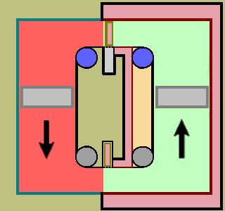 ![]() - Red area on the left is high pressure tube, where you collect energy. - Green area is the low pressure tube, where you lift the weighs. Low pressure tube is surrounded with pink gravitational shields. - Steady run needs more than 2 weighs. Might be possible to build machine with one tube. Move the shields sideways instead of pistons. - - - - System where you pressurize the shields is obviously inefficient, possible that you need more energy to pressure creation than you get with the machine. Can use such adjustable system in every where else but in energy creation and power plants. |