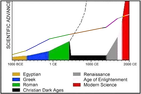 The line shows an approximation from the advance. Science advances with major breakthrough. Not with it's applications. Romans implemented Greek made science. East Rome started to decline after year 1000. Christians never destroyed old writings and techniques, they never caused downgrade to science. The old science and tech was developed and used for building churches and religious things. Really great scientists made their discoveries in between 1600 - 1800. Some of these really great science makers are know to be pious Christians, others just Christians. Nothing like Martin Luther and others, who revolted against catholic church.Besides Einstein and Nuke boys, there has been significant researches, upgrades and inventions in elsewhere : Einstein was unable to downgrade the overall development.