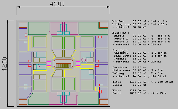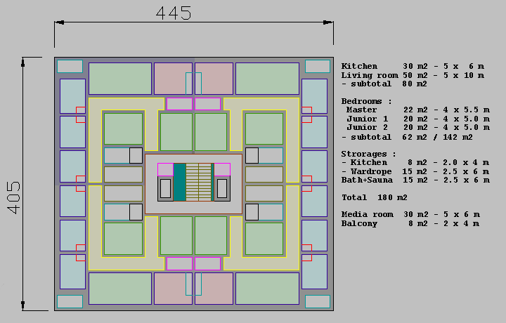 In this picture you see floor plan for the actual construction. Plan is for detached, stand alone house.The default apartment is 4 rooms + kitchen + media room. Space usage is optimized for four apartments per floor.