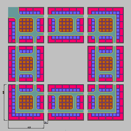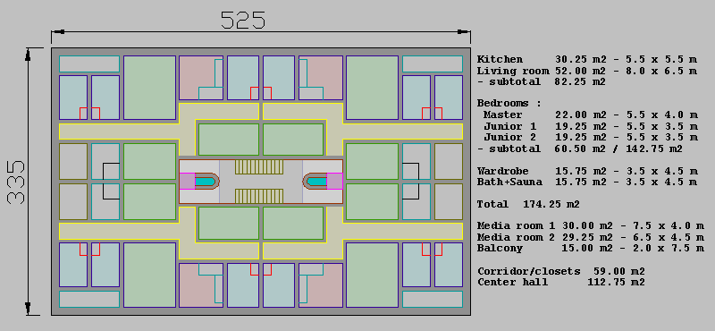 - Brown area in the center is for staircase and corridor. Purple boxes in the center are elevators. Smaller purples are for ventilation tubes / kitchens.