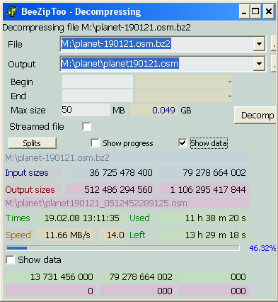 ![]() FILE : BZ2 file on disk OUTPUT : Output file skeleton - name gets always byte position, after name, before dot. - existing output files are over written without questions. BEGIN: Intended beginning position in BZ2 file. SHOW DATA : Show data about progress. DECOMP BUTTON : Begin decompression. You cancel the progresses with a click to some exe button. Six text fields at the bottom are for debugging and getting various values from the running program. |