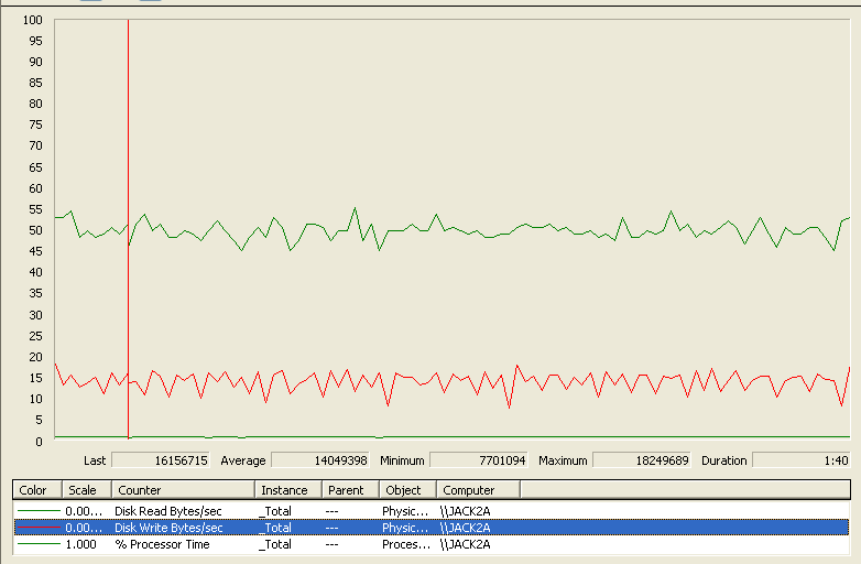 This screenshot is from Windows performance monitor. Taken at the same times with another screenshot. Disk output 10-19 MB/s.