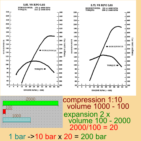 - power calculations are pressure calculations. Pressure is a force, which affects to one square meter area. When you create 10 bar pressure into cylinder, the creation of the pressure is independent from the material, into which you create 10 bar pressure. When you compress air, pressures and volumes matches. In liquids and solids the required volume change for 10 bar pressure is very small. When you remove progression from vacuums, you get into simple linear pressure-volume system.When dealing with table data : After you close the cylinder for compression and firing, molecule counts remain unchanged. The inlet temperature-density system sets the amount of fuel-air mixture you have in cylinder. In calculation expansion-pressure comes from density changes at inlet pressure-temperature system. When density doesn't change freely, gas expansion ( falling density ) converts into pressure.