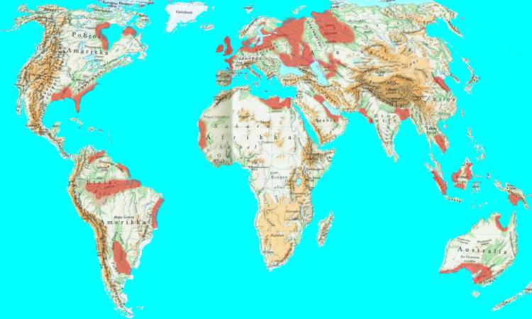 - At some point ocean levels were around 100 meter higher than now. Red areas