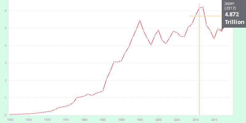 From this picture you can estimate the damages the nuclear accident caused. Japanese GDP was little around 5.8 trillions before the accident. After accident GDP raised two years, which totals to $1 trillion. The hike ended in 2013. GDP fell 500b, In 2014 fall was 700b. 2015 went with $1T downgrade. 2016 and 2017 went with 700b. 1 000 - 500 - 700 - 1 000 - 700 - 700 = $2 600 billions.Part from the fall comes from closed nuclear power plants.
