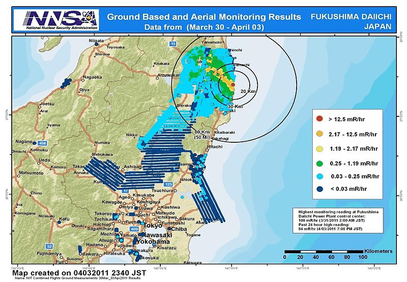 In this picture you see the on-ground gamma radiation from the plant. Two weeks after the accident. Winds were not very favorable, they pushed the radiation-scents towards Tokyo. Changed direction right before the city."Radioactive material was released from the containment vessels for several reasons: deliberate venting to reduce gas pressure, deliberate discharge of coolant water into the sea, and uncontrolled events."