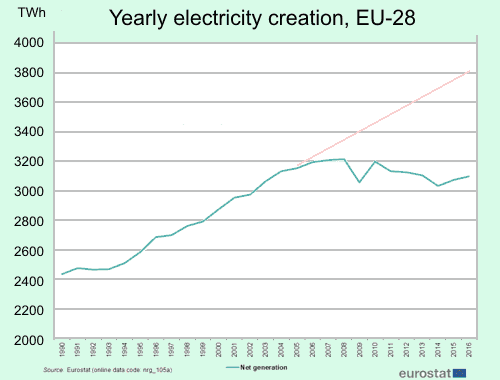 Conversion to prices The power creation curve after 2010 does not follow EUs growth anymore. From this graph you see how the stagnated production has raised the prices. Just like it always happens with oil. The earlier 80 GW cap moved to prices right after economy started to recover from 2009 recession. With the missing 80 GW capacity the price of kilowatt would have fallen or stayed unchanged after 2009. Eurostat does not publish picture like time-lined price graphs. Found an independent graph from 2016, in the graph the price continued to raise. EU countries combined growth has been somewhere near zero after 2010. In principle price should always raise with wages and healthy inflation.
