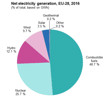 From this chart you see how EU creates electricity. Combustible fuels refers to coal plants, mostly. Great deal from natural gas is used for heating. Oil distiller produces also natural gases. Obviously the major source for gas plants and heating systems. Nuclear plants 25% share matches to major table in the above. Wind and solar plants are periodical. Their power production time is 30% or less. Hydro plant is seasonal, production falls during dry times / seasons. Since goal and gas forms almost 50% from power creation capacity, replacing all coal plants with nuclear and natural plants, would obviously end into a major catastrophe. The best way to use sugar oil in power production is electric generator, which is rotated with combustion engine. It is safe, relatively small and also efficient. In fixed installation, liquid fuel has the best weight / energy ratio. It is also safer and easier than gas. Gulf countries uses already big generator-combustion engine systems for creating electricity. Power companies are like oil companies. No matter how badly vuf-vufs messes the power production sector, the created mess is rather insignificant to power companies. If you for example have to close nuclear plants without replacement, the power company gets a good compensation for the lost capacity, from the sky high consumer prices. ( Ref : Californian energy crisis 2001 ) - - - - In 2017 USA share of combustible fuels has fallen to only 30%. |
