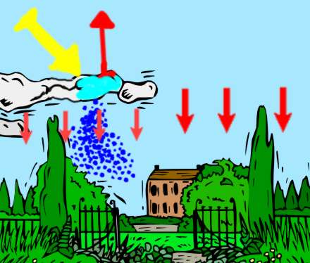 This old picture shows basics of clouds and humidity's meaning to climate during daytime.