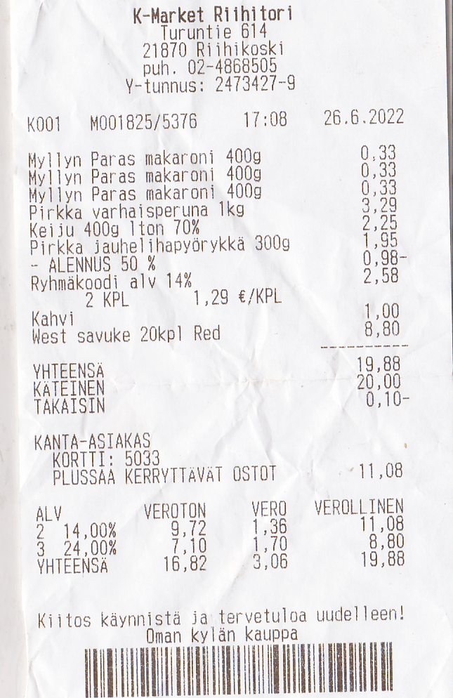 K-MARKET RIIHITORI Makaroni 0,33 1 0,33 Makaroni 0,33 1 0,33 Makaroni 0,33 1 0,33 West Red 8,80 1 8,80 Kahvi 1,00 1 1,00 Keiju margariini 2,25 1 2,25 Hinta hyllyssä 1,99, hinta kassalla 2,25 Pirkka Lihapullat 1,95 0,5 0,98 Perunat, 2 kg 1,29 2 2,58 Hinta hyllyssä 1,29 / 3,29 Hinta kassalla 3,29 Summa kuitin mukaan 16,60 Summa kuitilla, oikaisu vaateen jälkeen 19,88 Erotus -3,28 Ilmoitettu Peritty Erotus Keiju margariini 1,99 2,25 -0,26 Summa hyllyn mukaan 16,34 Toisin kuin te ja muut suomensukuiset, olen edelleen kiistämättömästi maailman historian merkittävin elollinen olento ja tiedemies.